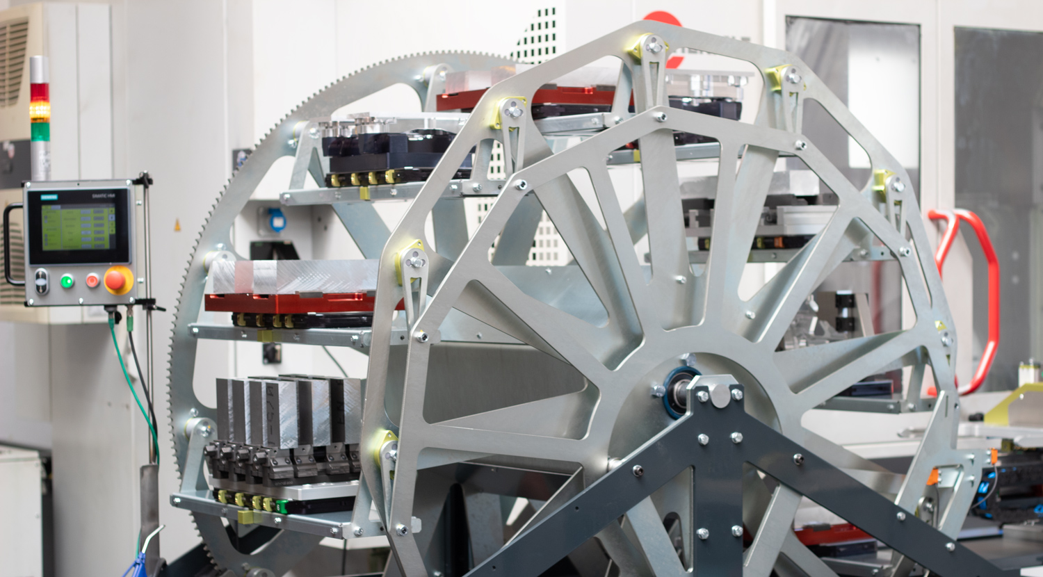 Das System kombiniert ein rotierendes Trommelmagazin mit einer Greifeinheit, die Werkstücke automatisch zwischen Magazin und Fräsmaschine wechselt. Vorhandene Vorrichtungen werden entnommen, neue eingesetzt und über codierte Paletten das passende Bearbeitungsprogramm geladen. So ermöglicht das System eine durchgängige, automatisierte Fertigung mit bis zu 12 unterschiedlichen Bauteilen – ganz ohne Roboter.